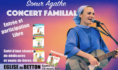 Nous vous invitons à participer au concert familial donné par Sœur Agathe le samedi 14 mars à 16h00 à l’église de Betton.
