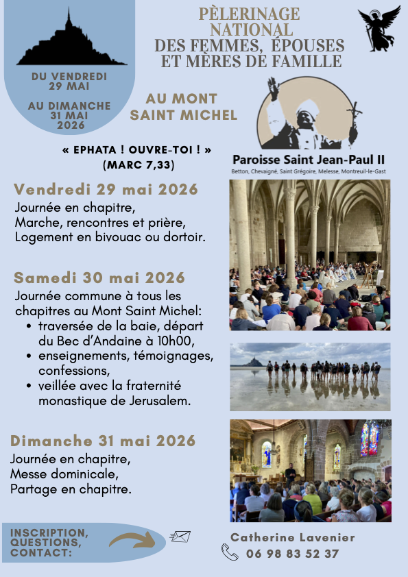 Pour la première fois, cette année, un pèlerinage vers le Mont-Saint-Michel est spécialement proposé aux femmes. À l’exemple des hommes, les femmes de la Paroisse se mettent à leur tour en route vers le Mont Saint Michel. Le pèlerinage national se déroulera du vendredi 29 au dimanche 31 mai. C’est l’occasion de prendre du temps pour soi avec le Seigneur et de passer de bons moments fraternels ensemble.
