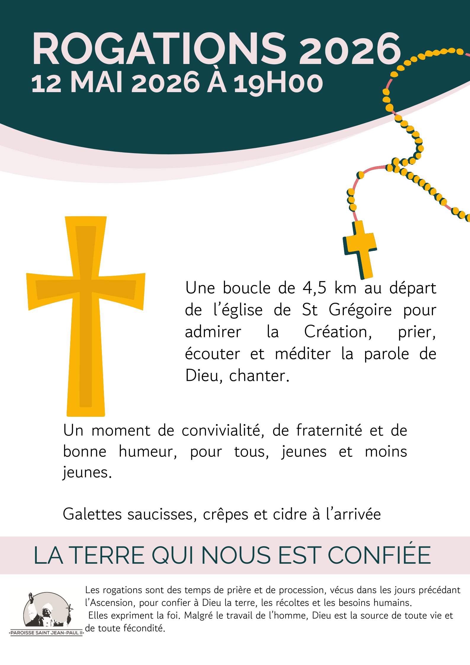Le mardi 12 mai 2026 à 19h00, la paroisse vous invite à vivre un temps fort de foi et de fraternité à l’occasion des Rogations.