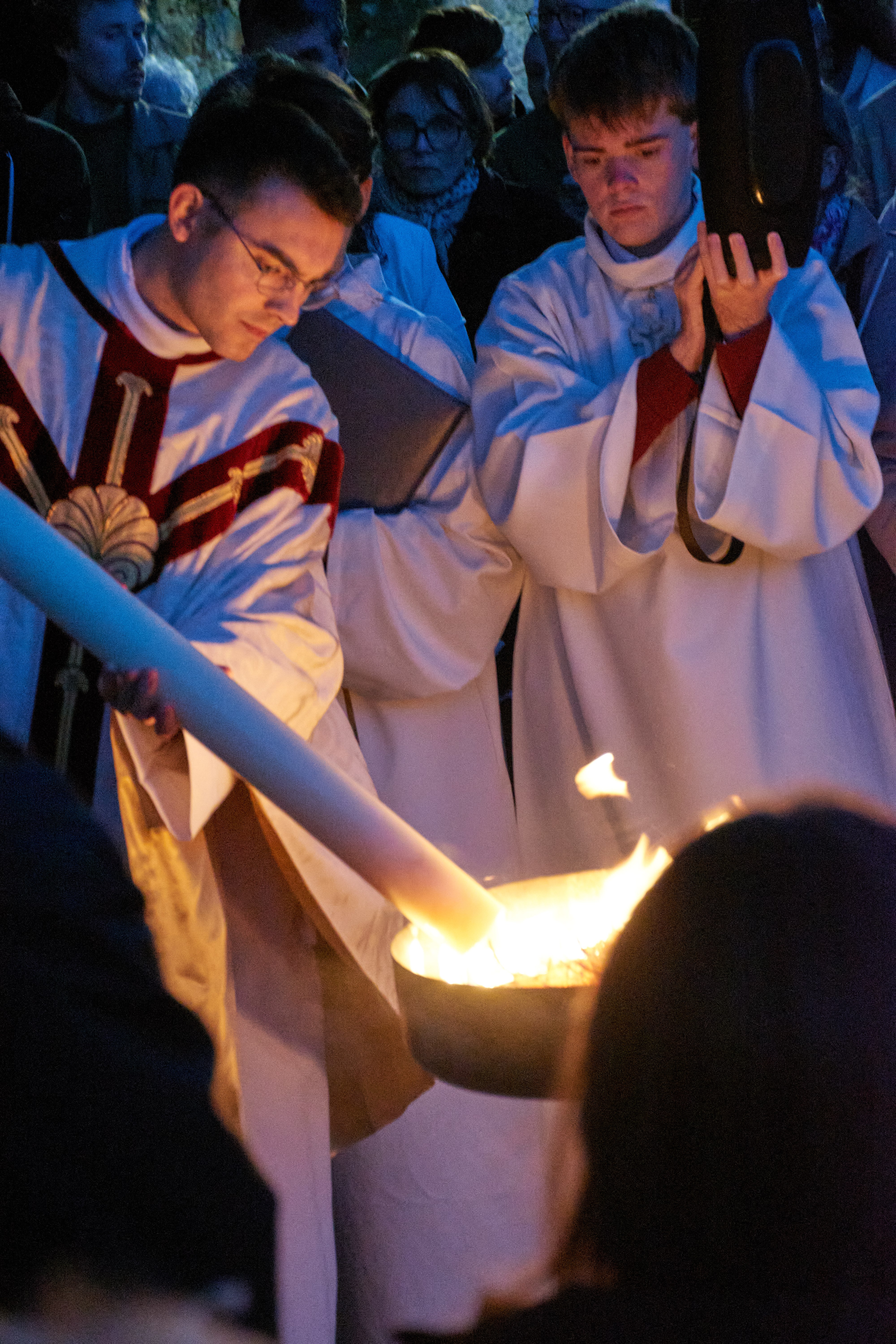 Les paroissiens se rassemblent dehors autour d’un feu. Chacun tient en main un cierge encore éteint. Le prêtre bénit le feu nouveau, symbole puissant d’une vie qui jaillit au cœur de la nuit. C’est de ce feu que sera allumé le cierge pascal, signe du Christ ressuscité.