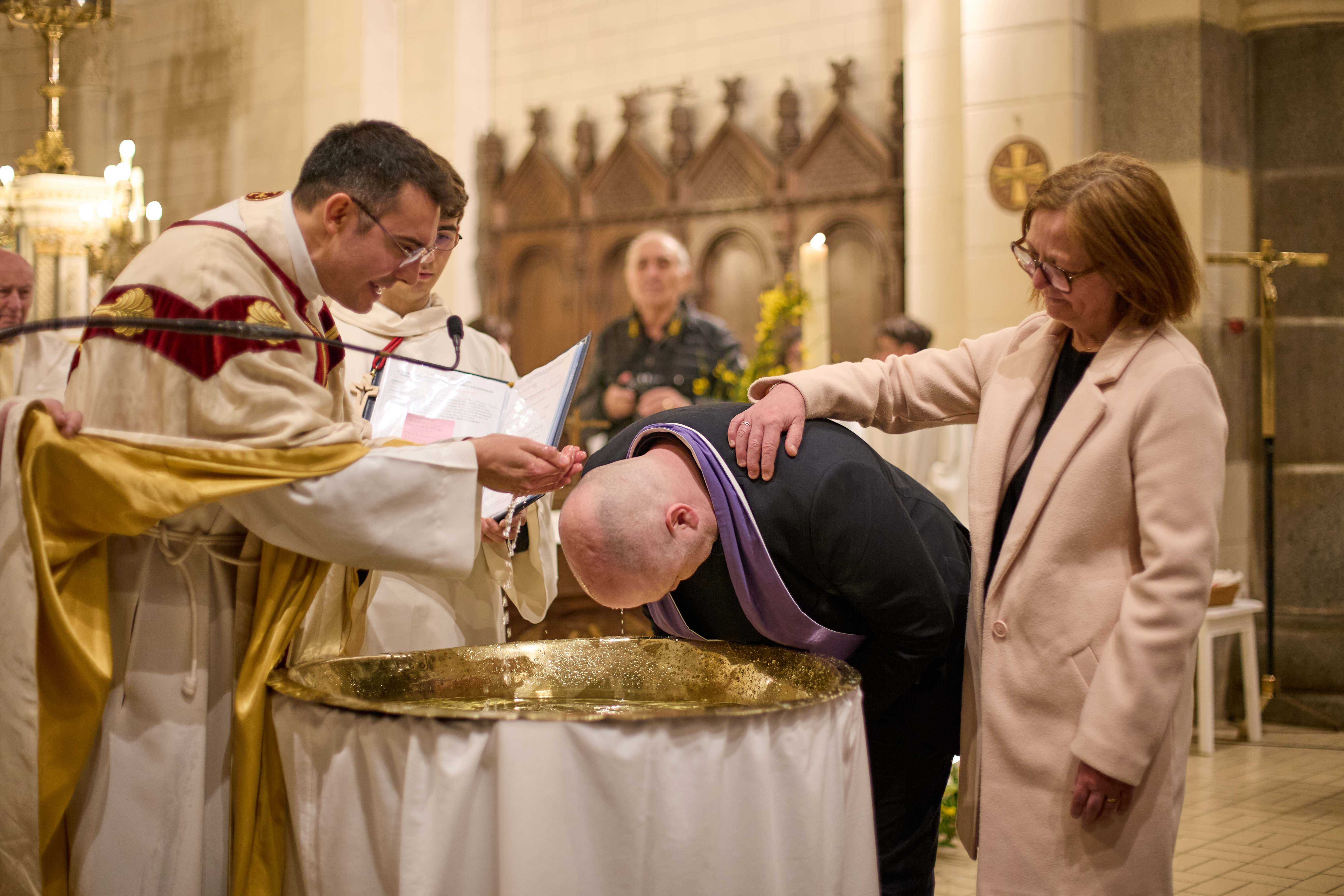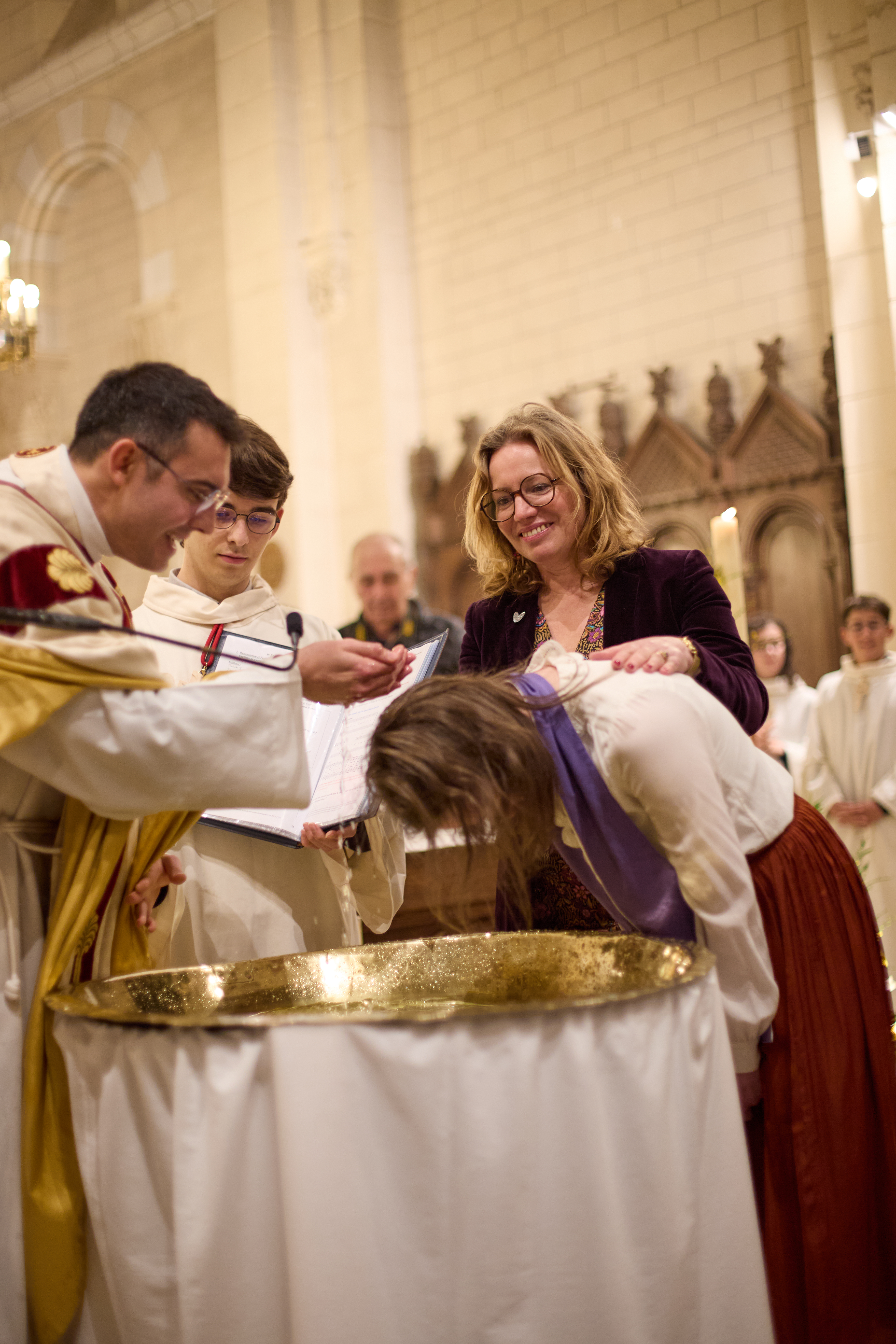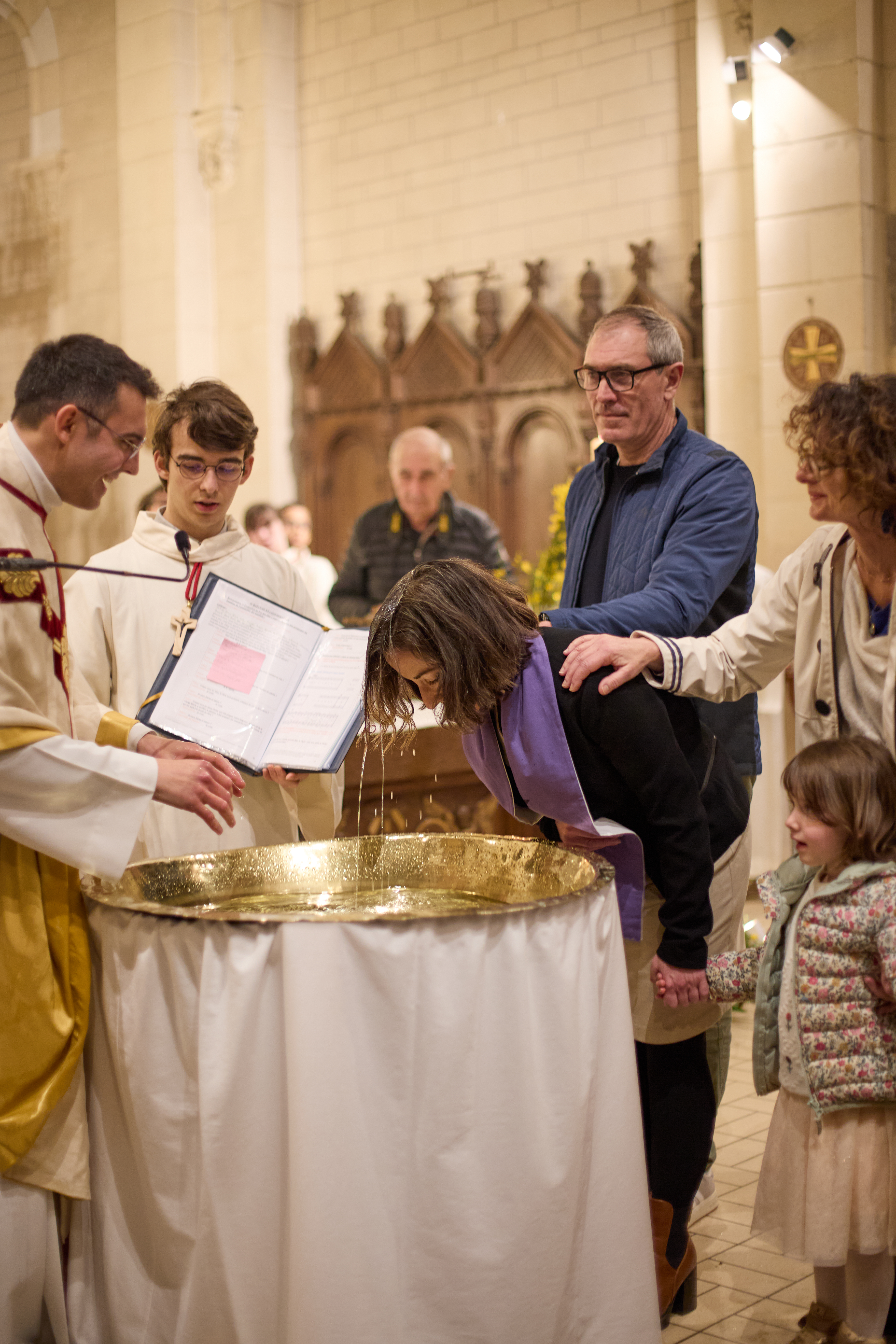 L’Évangile est proclamé. Puis vient un moment particulièrement émouvant : les futurs baptisés sont appelés à s’approcher de la fontaine baptismale. L’eau est bénite. Elle devient source de vie nouvelle. Les catéchumènes renoncent au mal, professent leur foi, et reçoivent le baptême. Chacun renaît dans la lumière du Christ.
