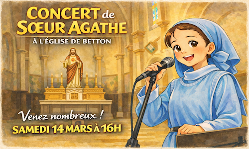 Nous vous invitons à participer au concert familial donné par Sœur Agathe le samedi 14 mars à 16h00 à l’église de Betton.