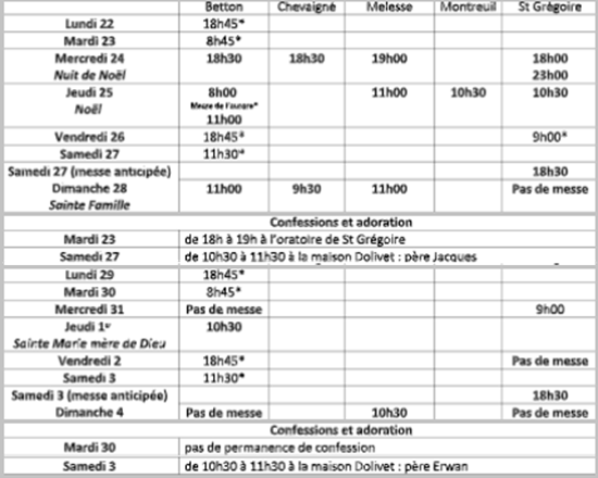Messes et confessions du 22 décembre 2025 au 04 janvier 2026, Betton, Chevaigné, Melesse, Montreuil-le-Gast, Saint Grégoire