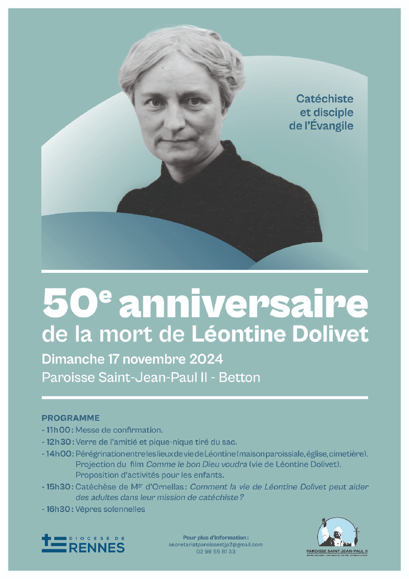 - 15 h 30 : Catéchèse de Mgr d’Ornellas : « Comment la vie de Léontine Dolivet peut aider des adultes dans leur mission de catéchiste ? » ;