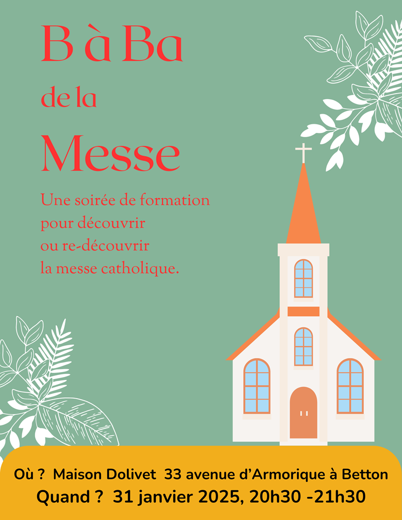 Après la soirée de formation du vendredi 22 novembre 2024 consacrée au "B à Ba de la Prière" , il vous en est proposé une nouvelle afin de découvrir ou re-découvrir le déroulement de messe catholique et le sens de chacune des parties, intitulée le "B à Ba de la Messe".