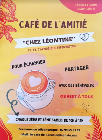 La paroisse Saint Jean-Paul II propose de vous accueillir "Chez Léontine", un café de l’amitié, dans lequel chacun peut partager les bons et les mauvais moments qui jalonnent son quotidien, échanger sur tout sujet en toute discrétion, pallier la solitude de ceux qui la ressentent, s’entraider pour faire face à une situation difficile, être mis en relation avec les associations caritatives (Secours catholique, Tabgha Solidarité...), parler en toute simplicité de ce qui fait la vie des uns et des autres.