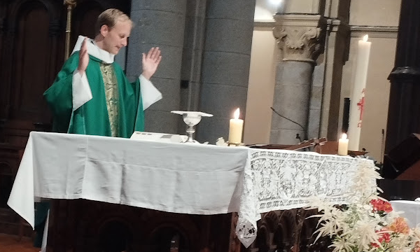Ce 30 juin, Père Hubert Rime a présidé la messe dominicale à Betton ; il était entouré des diacres de la paroisse, Théo Louvet et Samuel Marquet, et du séminariste Benoît Pommier qui réside ponctuellement à Betton.