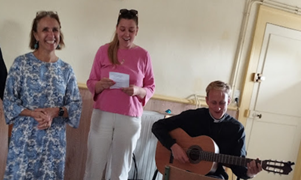 A l’issue de la messe, un temps convivial rassemblant les paroissiens des cinq clochers était organisé à la Maison paroissiale Dolivet à Betton. Un diaporama réalisé par Tiphaine, la fille d’Armelle, condensait les diverses actions réalisées auprès des jeunes ; cela a permis à chacun de mesurer ce qu’avait été cette mission pendant une décennie. Rédigée par un groupe de jeunes, une chanson vantant les mérites d’Armelle et interprétée sur l’air de « Santiago », était orchestrée par Léa.