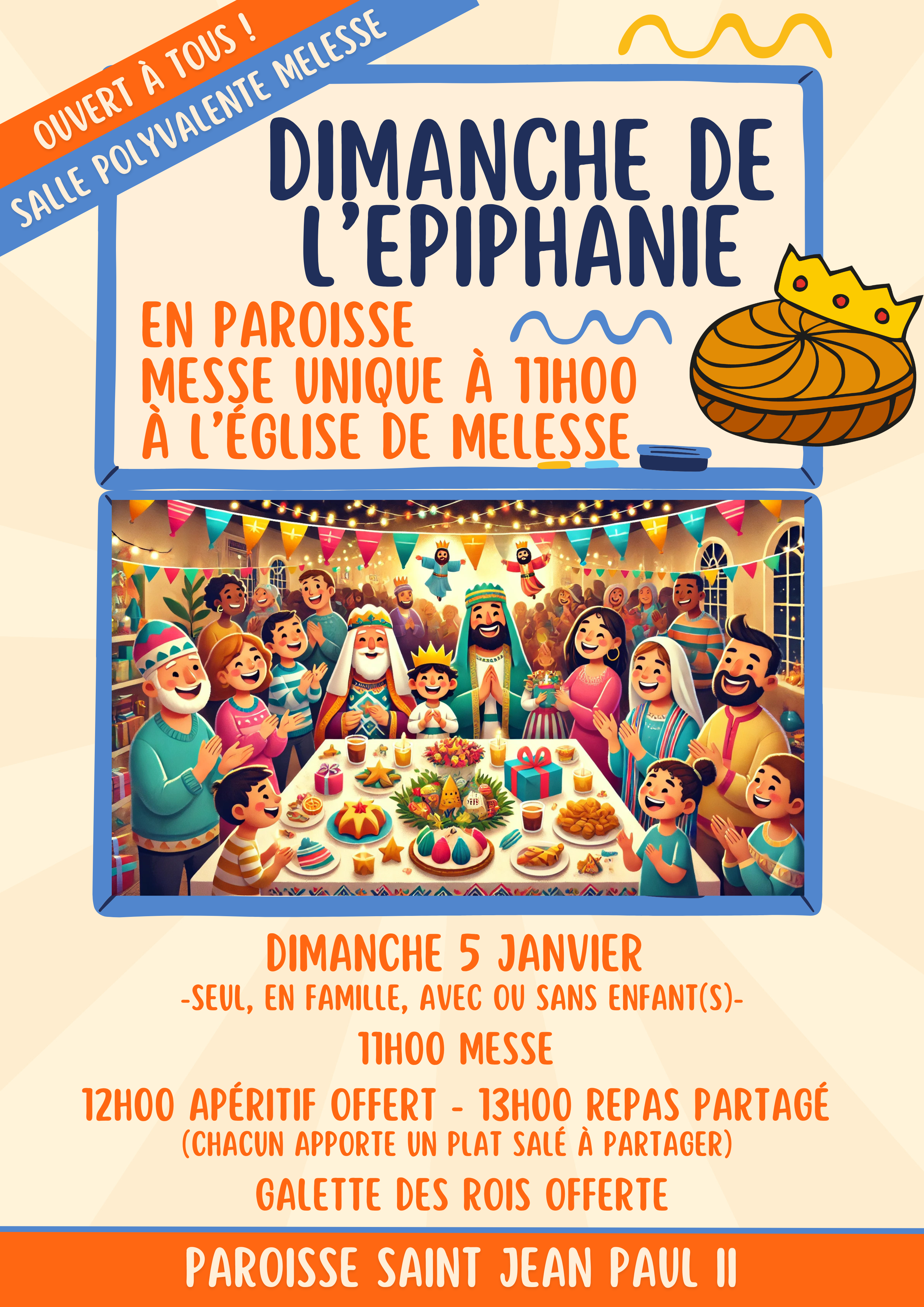 A l’occasion de la nouvelle année, les prêtres et le Conseil pastoral paroissial vous invitent le dimanche 5 janvier à 11h00 à Melesse pour la messe de l’Épiphanie qui rassemblera nos 5 clochers (messe unique pour toute la paroisse).