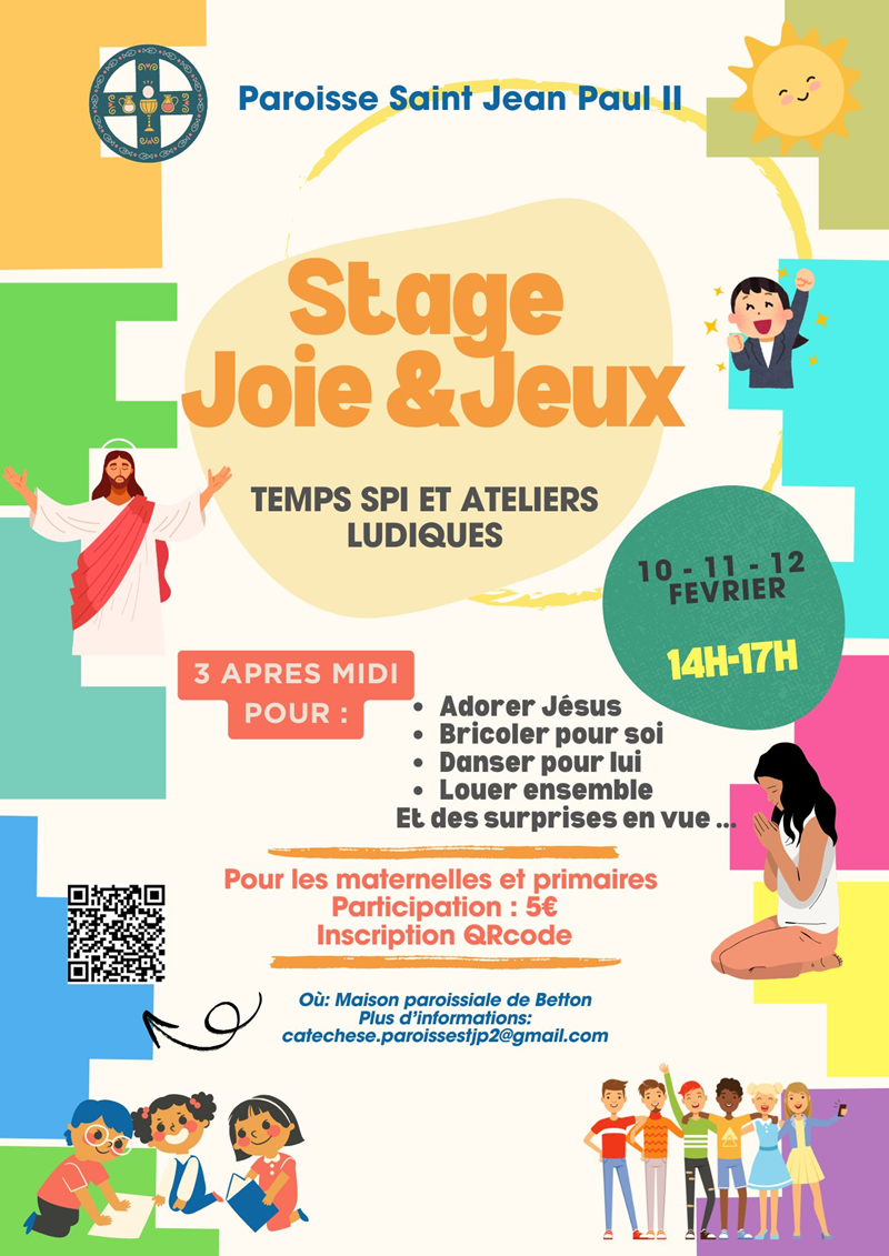 Pour les enfants de 3 à 10 ans, lors des vacances d’hiver, les lundi 10, mardi 11 et mercredi 12 février, de 14 h à 17 h, la paroisse propose un stage « joie et jeux » à la Maison Dolivet à Betton.