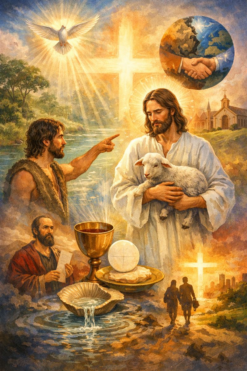 Jésus, l’Agneau de Dieu, enlève les péchés du monde en prenant sur lui nos fautes. Par son sacrifice, Il transforme notre mort en vie. Le baptême et l’Eucharistie sont les moyens concrets par lesquels nous recevons cette grâce et renouvelons notre unité en Lui.