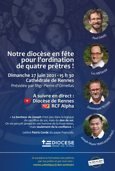 Le dimanche 27 juin 2021 à 15h30, Mgr Pierre d’Ornellas ordonnera quatre prêtres pour le diocèse de Rennes. Un évènement porteur d’espérance pour l’Église !