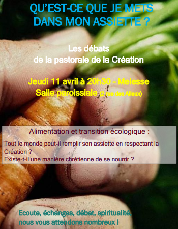 La PASTORALE DE LA CREATION de la paroisse sur l’ALIMENTATION vous propose une première soirée débat, sur le thème : "Qu’est-ce que je mets dans mon assiette ?"
