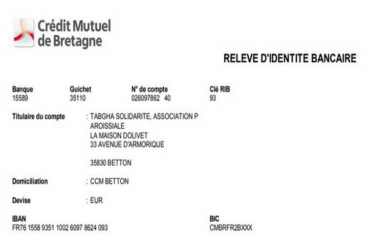 Votre don peut se faire sous forme d’espèces, de chèque libellé à l’association Tabgha Solidarité, remis aux accueils des maisons paroissiales ou de virement bancaire qu’il soit ponctuel ou régulier (relevé d’identité bancaire ci-dessous).